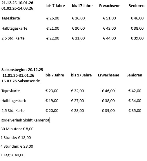 Beim Kauf einer Tages, –Nachmittags,- 2,5 Stunden, -oder Skitestkarte von einem Erwachsenen erhalten die Kinder bis 8 Jahre eine Gratistageskarte (nur in Kombination 1 + 1).